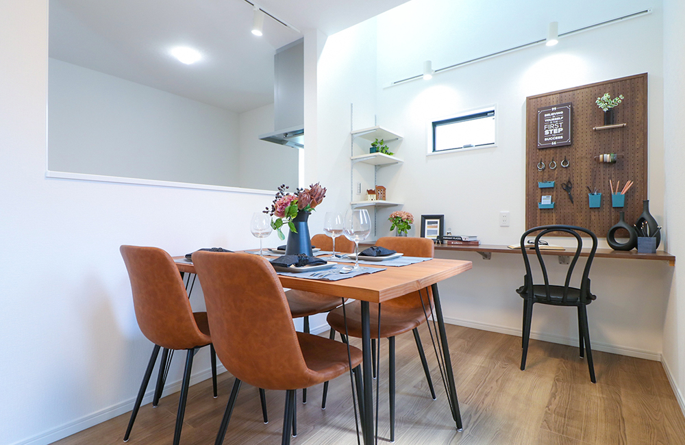 ダイニング横のスタディカウンター上部は、3階からの明るい陽光を、LDKに届ける吹抜け空間です。キッチンから目が届く場所にあるので、料理をしながらでも、勉強や遊んでいる子どもとの会話を楽しめます。在宅ワークでも、カウンター上に設けたコンセントで、パソコンやスマホの充電時に便利に使えます。またいつでもスッキリと片付き、オシャレに使えるように、可動棚や有孔ボードを設けています。