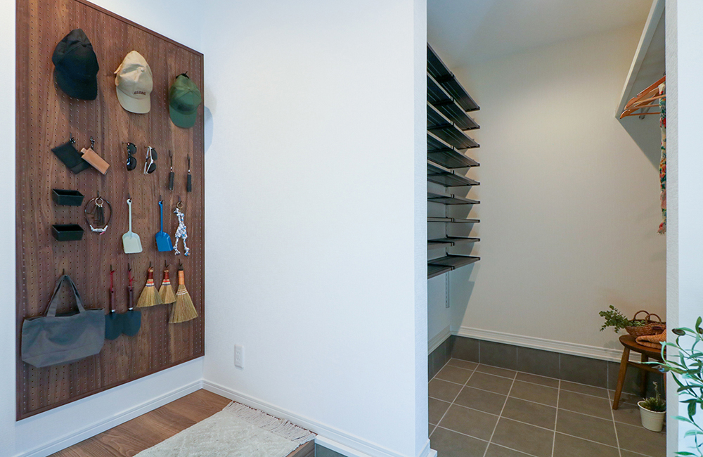 玄関横の土間収納は、ベビーカーやゴルフバッグ・アウトドア用品などを、そのまま置けるゆとりのスペース。玄関先でコートなどのアウターを掛けられる、ハンガーパイプも設けており、服についた花粉など、家の中に持ち込む事がなく安心です。また玄関壁面の有孔ボードは、フックを取り付ければ、カギや帽子などお気に入りのアイテムを、楽しくディスプレイできます。