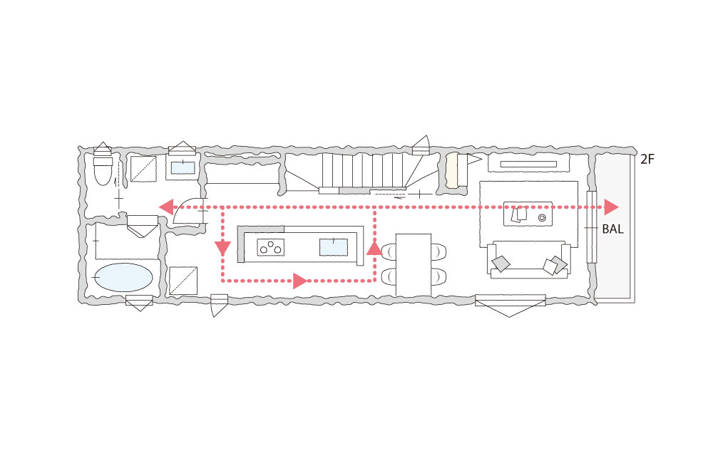 洗面室とバルコニーを一直線でつなぎ、ぐるっと回れるキッチンで「ながら家事」ができる、コンパクトな家事動線になっています。キッチン横にダイニングがあり、料理の配膳や後片付けもラクに行うことができます♪
