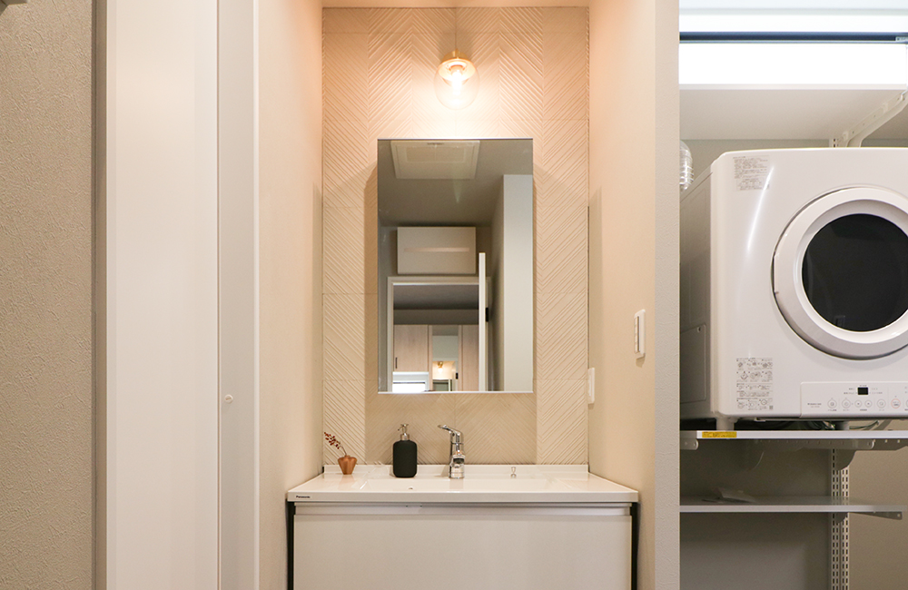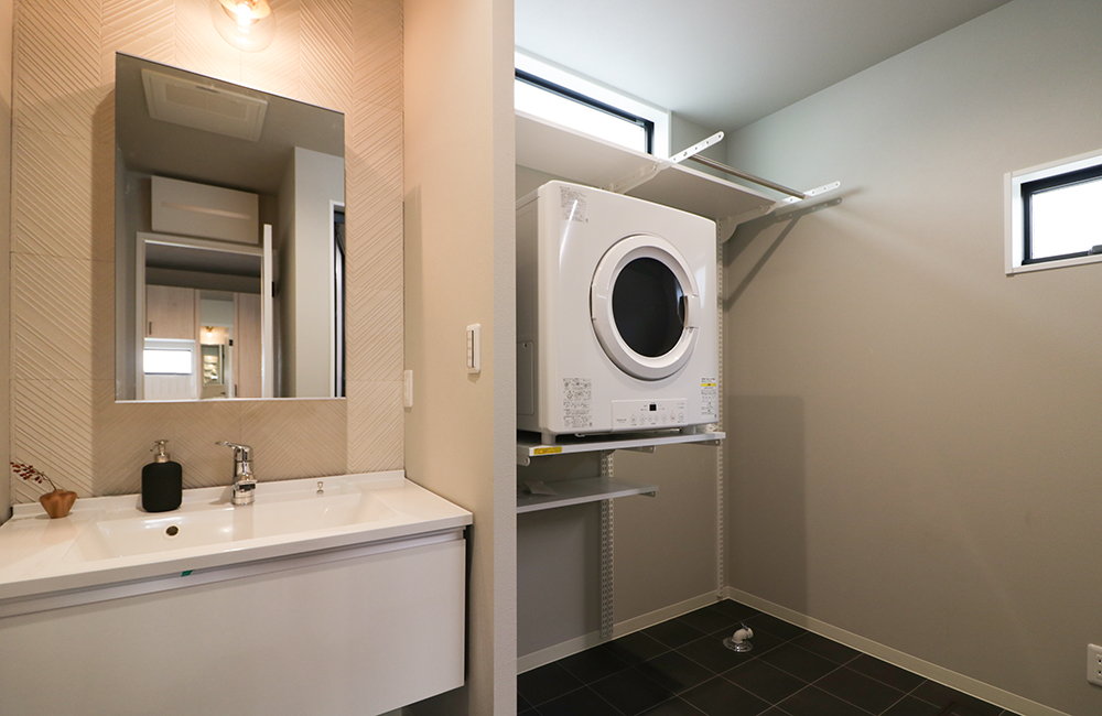 玄関↔洗面脱衣室↔キッチンで、ぐるっと回遊できる動線を取り入れました。キッチンで作業しながら、洗濯や掃除ができ、玄関とキッチンの2方向から行き来できるので、朝の準備もスムーズになりそうです。約3帖の洗面脱衣室には、乾太くんと収納棚を設けました。乾太くんがあるので、洗濯→乾燥→畳むが1箇所で完結。また、天井に下地を入れているので、洗面室で室内干しをしたくなったら、物干し金具を取り付けることができます。