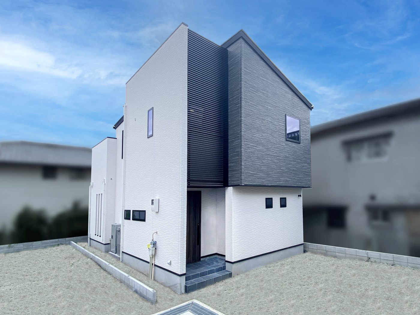 ホワイトとブラックでまとめたモダンな外観。ルーバーで窓を隠しており、プライベート感UP&プライバシーにも配慮しました。正面の窓を少なく感じさせてくれるため、かっこよくもシンプルなデザインになっています。