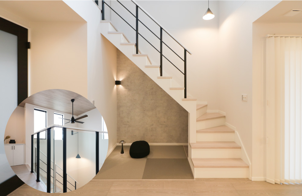吹抜けにリビング階段を組み合わせ、より開放的なLDK空間に。2階廊下の手すりには透明樹脂パネルを使い、抜け感を高めることで、1F・2Fがより繋がり、家族とのコミュニケーションも取りやすくなっています。踊り場上に取り付けた、吊り下げ型のブラケットライトは空間のアクセントに。吹抜け下の畳コーナーは、ごろんとお昼寝をしたり、お子さまの遊び場としても使えるくつろぎのスペースです。