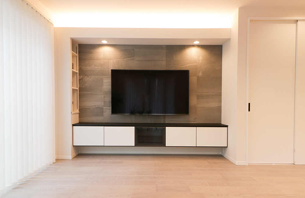 空間全体を柔らかい明るさで包んでくれる「コーブ照明」と、リビング上部とに、調光できる照明を施しました。夜映画を見る時は明かりを落とすなど、気分や使用用途に合わせて調節できるようにしました。TVボードの背面には、ダークグレーのエコカラットを施し、ダウンライトがエコカラットの陰影を浮き上がらせ、上質な空間を演出します。フロートタイプのTVボードに、壁掛けTVと、お部屋もスッキリ見え、掃除も楽になります。