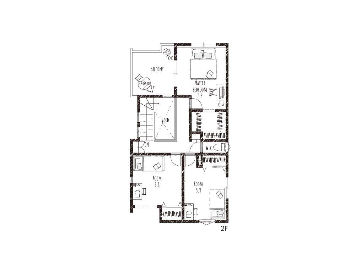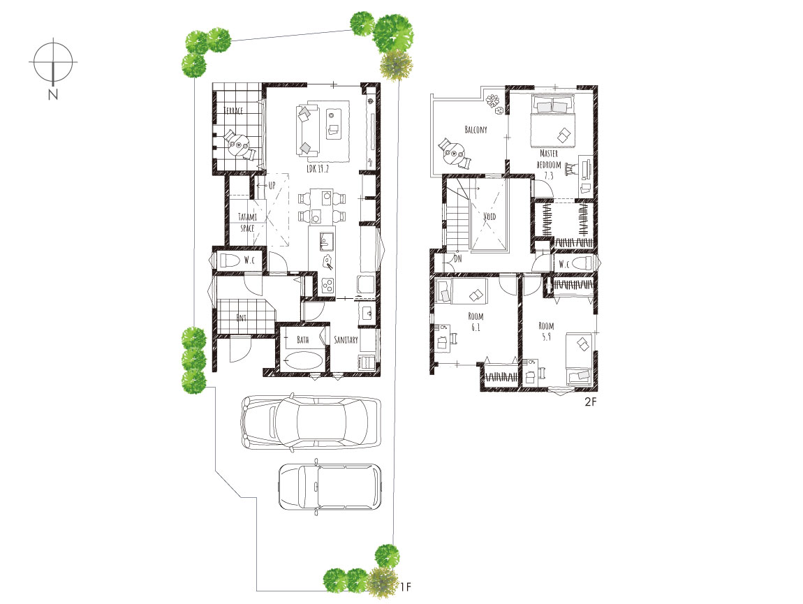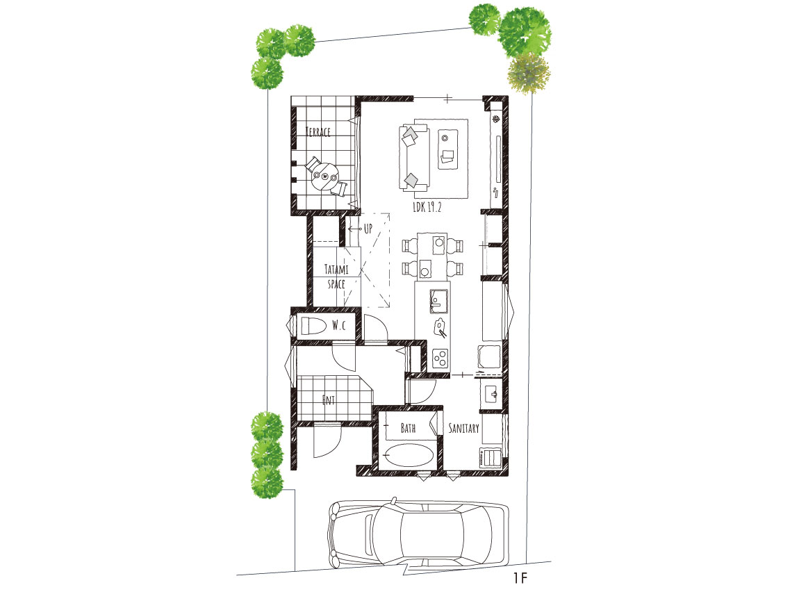 敷地の奥が南側の為、いかに陽当たり条件の良い南側を活かしたプランニングができるか検討を重ねていきました。採光が確保できるよう南面に空きスペースを確保し、吹抜けからの採光や駐車スペースと建物ボリュームの調整・広く見せるためにはどうしたらよいかなど、工夫を凝らしプランニングしました。