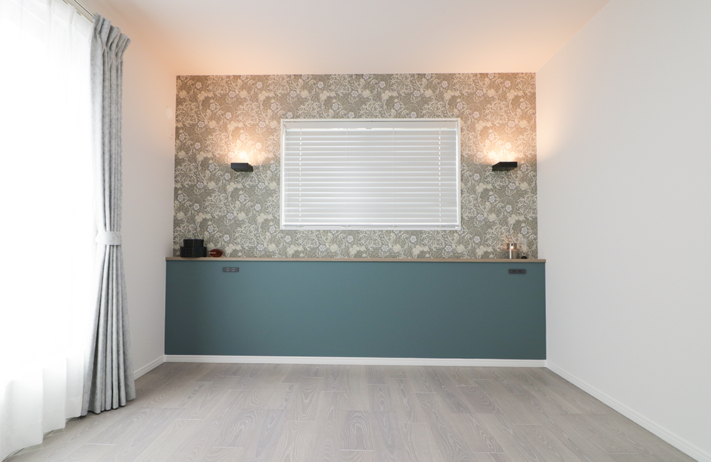 造り付けのヘッドボードに、スタイリッシュなブラケット照明を配し、ホテルのようなリラックスできる主寝室に仕上げました。ヘッドボードには左右2か所コンセント設け、ブラケットライトのスイッチは、「とったらリモコン」を採用。ベッドの上から動かず、スマホの充電や電気をスマートに消すことができます。壁面はダークトーンのウィリアム・モリスのクロスとダークグリーンクロスを貼り分け、落ち着いた空間になっています。