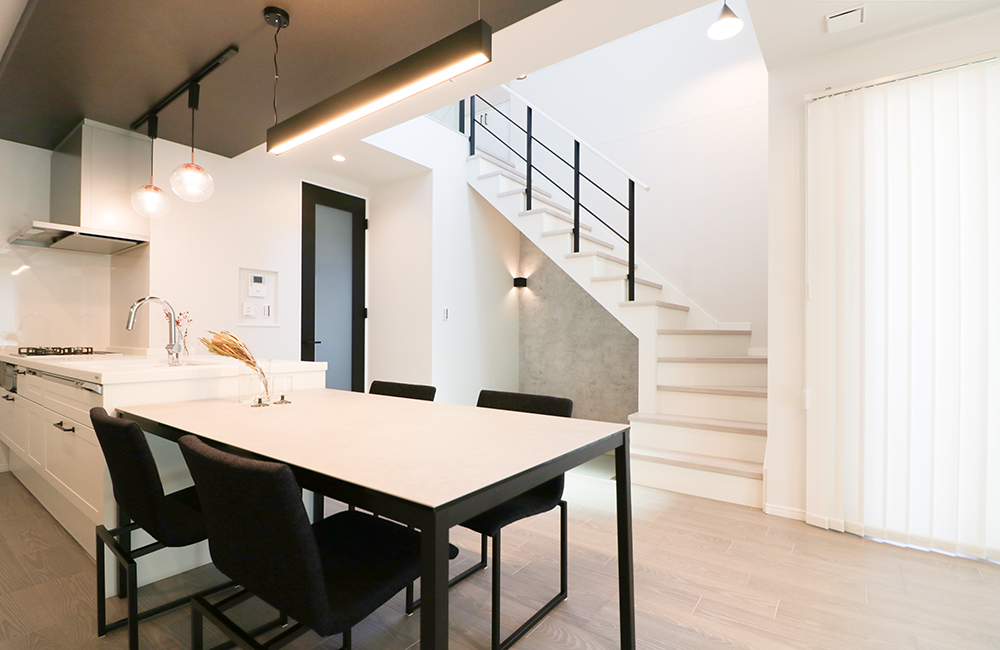 柔らかいシックなグレーの床材に、建具・照明・壁紙でブラックを取り入れ、落ち着いた印象に。ダイニング上やキッチン手元・洗面など照明デザインにもこだわり、シンプルながらも空間にアクセントを加えました。TV面や洗面化粧台にはタイルを施し、機能面もデザイン性も考慮しています。2F居室にはウィリアム・モリスのクロスを取り入れ、大人っぽくも遊び心のある空間に。