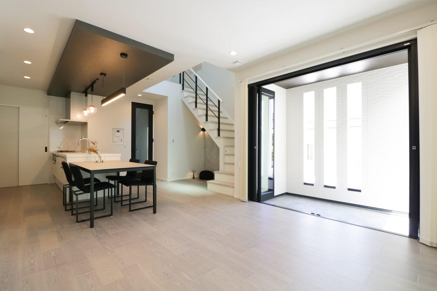 LDKとソトの間に、屋根があるプライベートテラスを設けました。リビングに面した窓は、全開放を実現する折戸タイプを使うことで、住まいの内と外をひとつに。外壁にスリットがあるので風が通り心地よく過ごせます。昼は日光浴・夜はお酒を嗜むなど、ご家族が好きなように過ごせ、ちょっとした非日常を味わえる特別な空間に。お庭へもステップで繋がっており、ガーデニングをしたり、お子様やペットの遊ぶスペースとしても。
