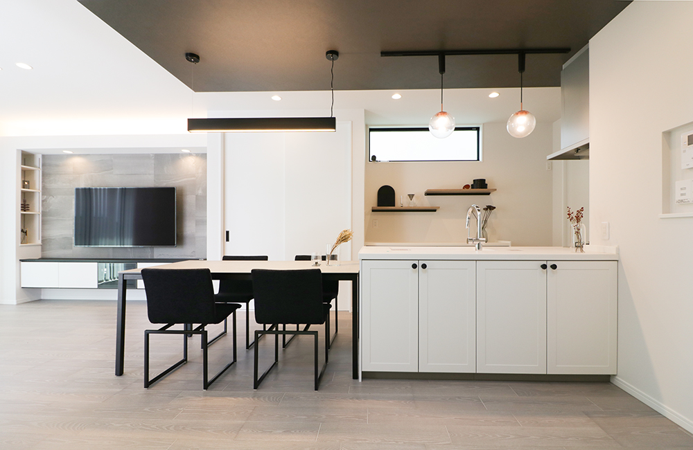 ウチソトに繋がるプライベートテラスと、心地よい間接照明のあるお家が完成しました。リビングの延長線上にテラスを設け、壁で囲ったプライベート屋外空間。外からの視線を遮ることで、個室のようにゆったりくつろぐことができます。リビング上部とTVボード上の照明は調光でき、気分に合わせて日常空間とリラックスタイムを使い分けて。永く住み続けられるよう、1年間で消費するエネルギーの量を実質的にゼロ以下にする「ZEH」を採用し、室内の温度変化が少ない「第一種換気」も取り入れています。内装は奥行を感じる柔らかいグレーの床材をベースに、ブラックをアクセントに加え、シックで落ち着いた大人っぽいテイストに。キッチンを中心にプランニングし、生活動線やご家族とのコミュニケーション面も視野に入れ、トータルで心地よい暮らしができる住まいに仕上がりました。