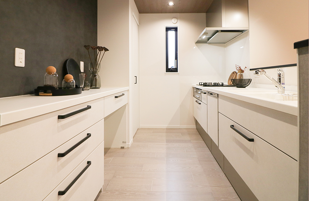 リビングからは見えづらい位置に配置したキッチンは、ほどよい個室感があり、落ち着いてお料理できる場所。急な来客やホームパーティーの時でも使用済みの食器やゴミなどの生活感も見えづらくなっています。キッチン背面にはパントリーやカップボードなどの収納があり、よく使う調味料やストック類も取り出しやすく、料理ができたらカップボードで盛り付けて、料理動線もスムーズになります。