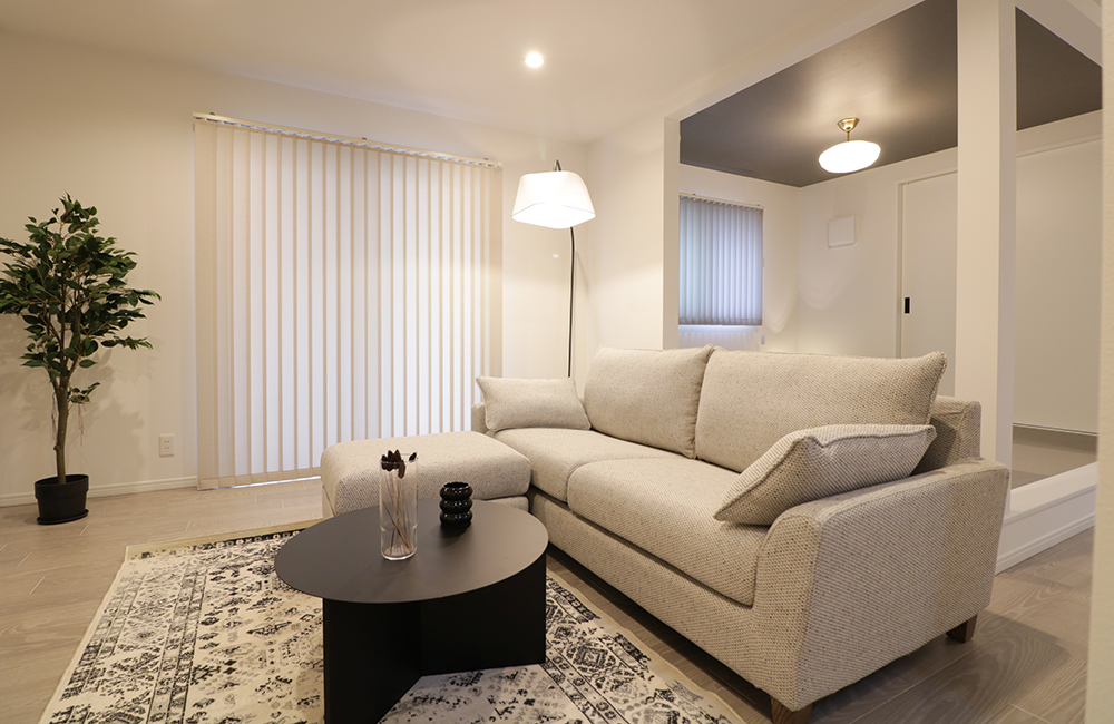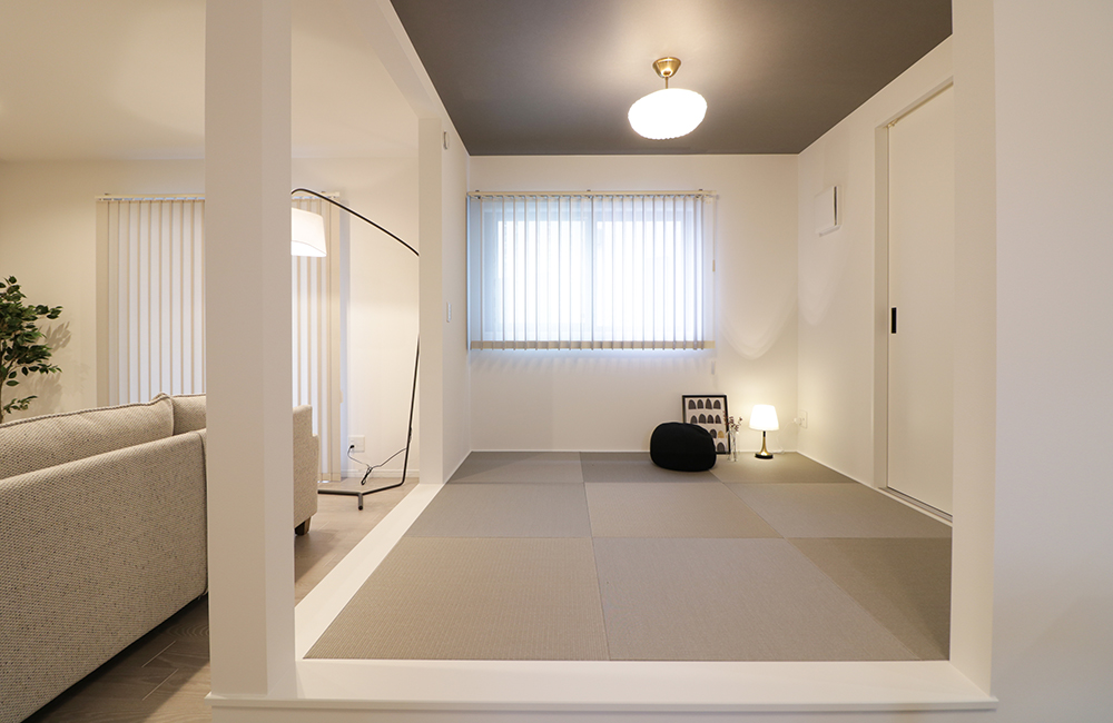 子どもを遊ばせたり、家事の間にちょっと休憩したり、洗濯ものを畳んだり。趣味や仕事のためのワークスペースとしても活用できる畳コーナーをリビングの一角に設けました。小上がりになっているので、ソファがわりに腰掛けたり、ロールスクリーンなどで間仕切れば、お客様に泊まっていただくスペースにもなります。琉球畳とブラックの天井は、リビングのアクセントになったスタイリッシュな空間です。