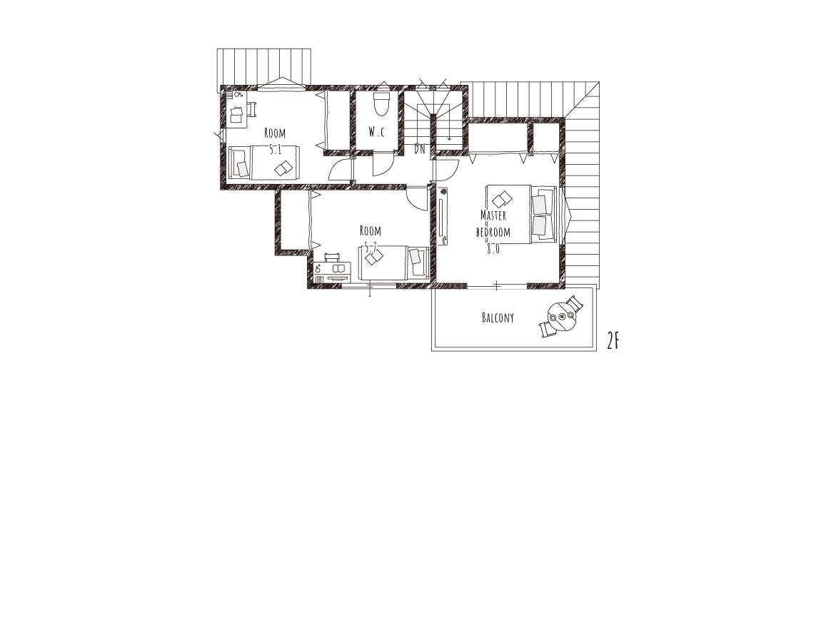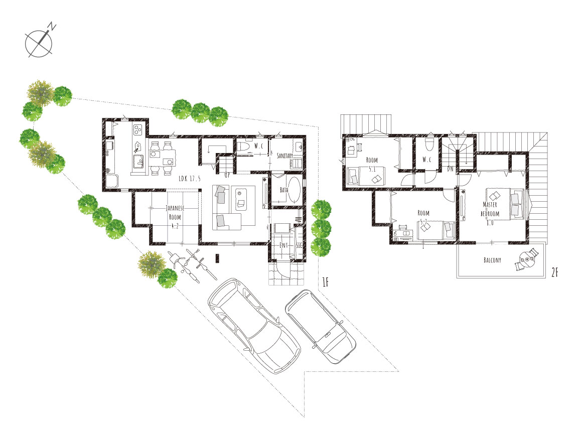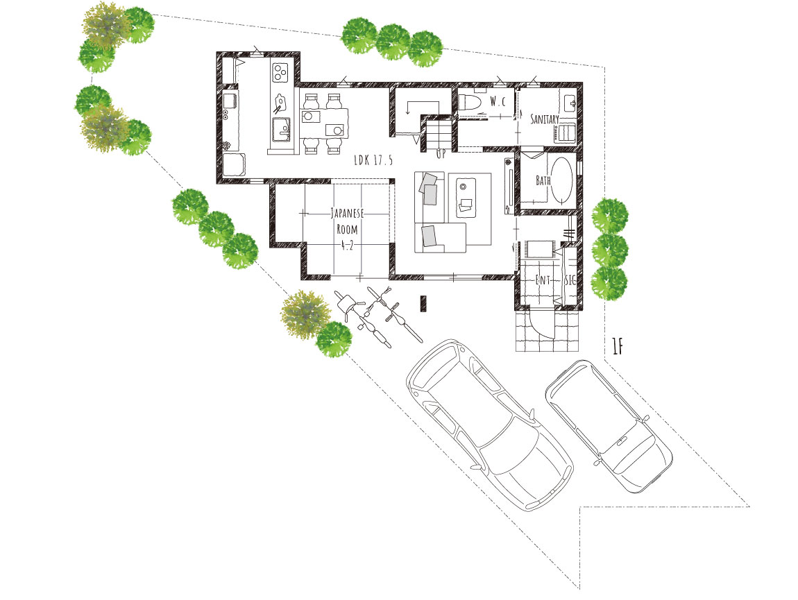 敷地に余裕があるので、特に1階は奥行きを活かして広々とした空間が感じられるような建物配置にしています。2階は高さの制限を考慮し、天井が低くなるところは出来るだけ居室部分が干渉しないような配置にしました。北側に高さ制限があり、屋根の形状や勾配、室内天井・建物全体の高さの検討に苦労しました。玄関ホールから近い位置にトイレ、洗面、階段を配置し、DKを奥にすることで、来客時にもプライバシーが守られるように配慮しています。
