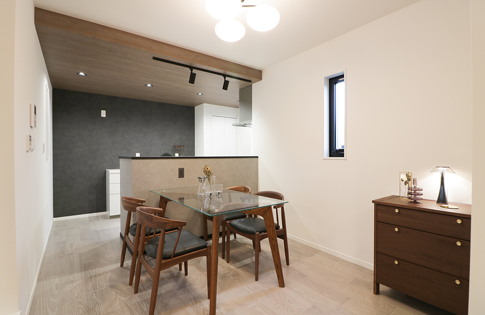 リビングのフローリングは、天然木ならではの豊かな表情と、モードなスパイス感を味わえるニュアンスのあるグレーの突板材を使用。その風合いとトーンを合わせて、キッチン部は漆喰調の壁紙や木目の美しいマットな質感の壁紙を天井にあしらい、少しずつ違うグレーと少しずつ違う風合いを重ねて、上品なモノトーンに仕上げています。照明やダクトレール、コンセントにはブラックの無機質な印象のものを使用し、大人っぽくスタイリッシュなアクセントをきかせました。
