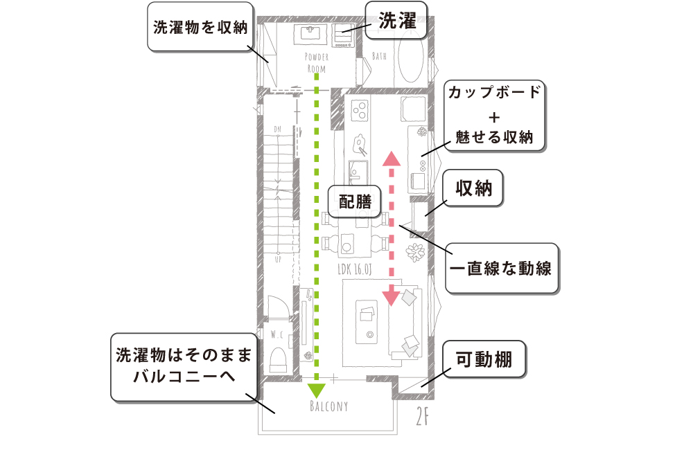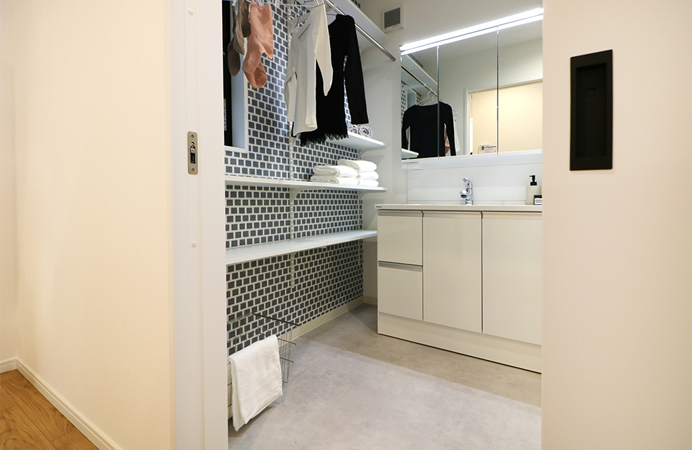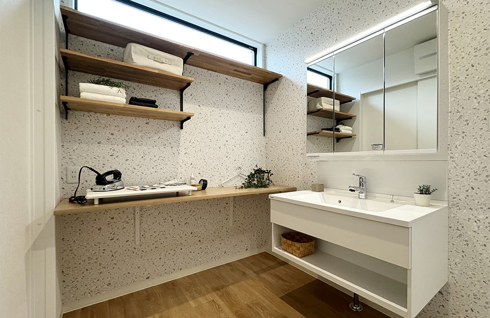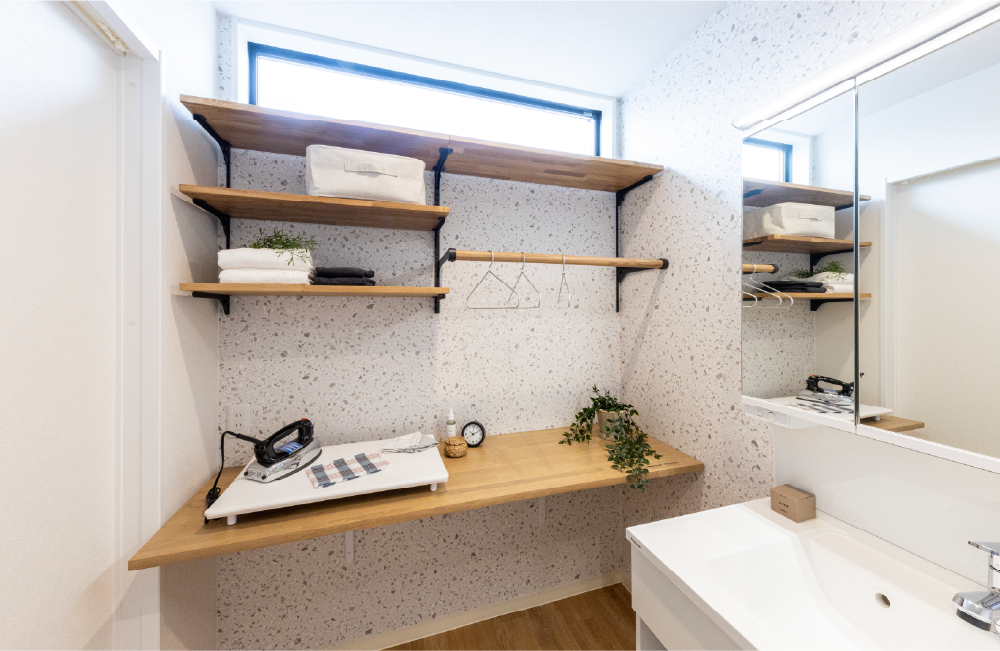 洗面室には、可動棚とカウンターを設けました。棚にはタオル類や洗剤類などを収納。カウンター下には脱衣カゴや引き出し収納を置いて、下着類やパジャマなどをしまえば、着替えを取りに行く手間も無くなります。お風呂の浴室乾燥機を使えば「洗う→乾かす→たたむ→収納」もワンコーナーで完結できます。