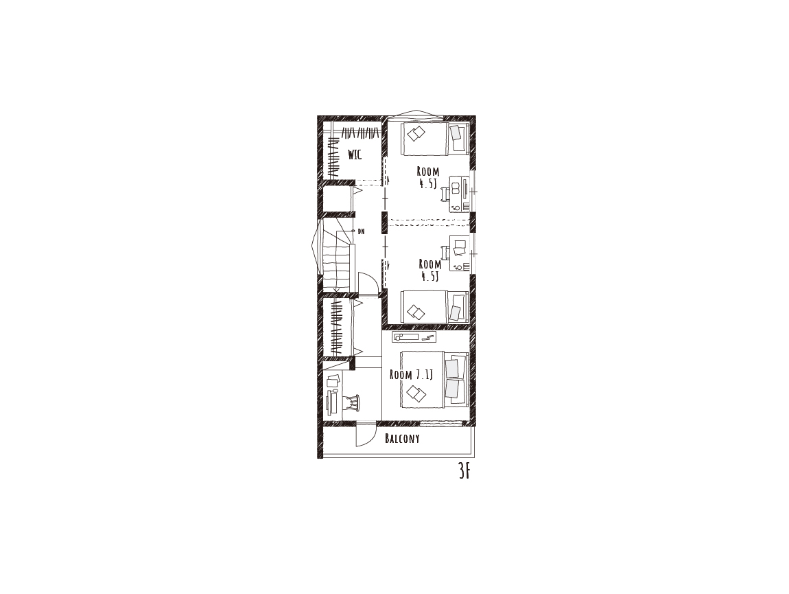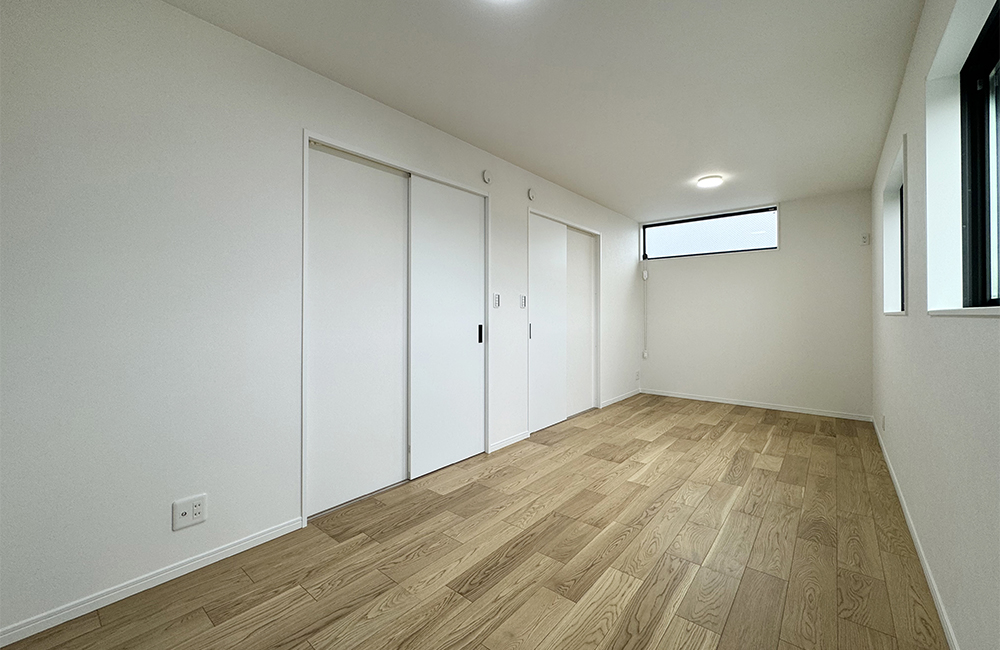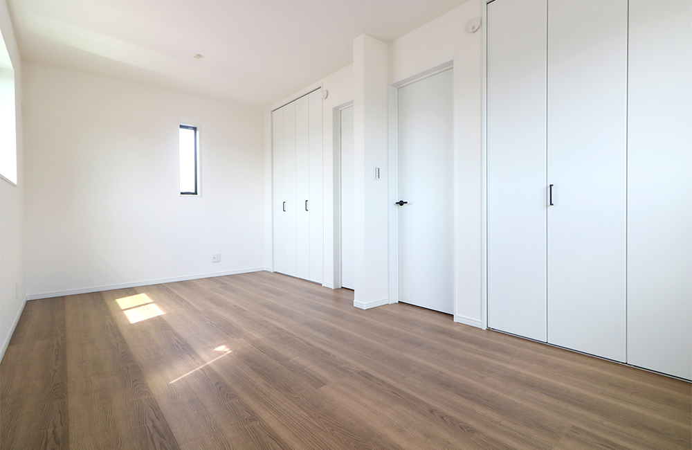 3階にお子様の成長や要望にあわせて、将来間仕切りのできる約9帖の部屋をご用意しました。子どもが小さい頃は、家族みんなが一緒に眠るファミリースペースとして使用。一人部屋が必要になったら、壁を付けられるよう下地やドア、エアコン用コンセントなどを用意しています。すぐ隣にファミリークローゼットもあるので、家族みんなの衣類もまとめて収納できます。