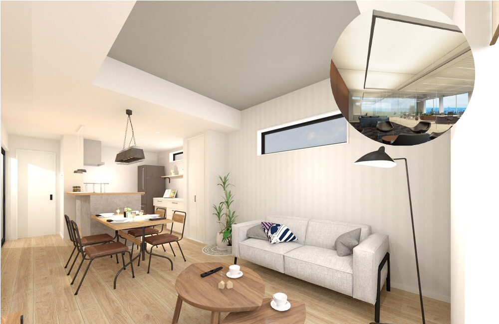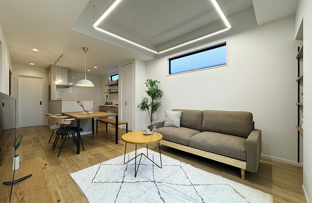 家族との大切な時間を過ごす場所として、LDKにもこだわりを詰め込みました。陽当りが良く風通しのいい2階リビングは、家族が自然と集まるくつろぎの場に仕上がりました。天井高2.8mの折り上げ天井は、立体感と開放感を演出し、スタイリッシュな雰囲気に。天井部分には、光のラインを描くようなシンプルで美しい照明を取り入れ、明るく落ち着きのある空間となっています。