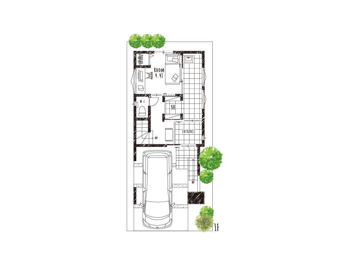 1階には大きな土間収納を設けており、収納だけでなく趣味用の作業スペースとしても使える空間になっています。2階に水廻りを配置し、キッチン→ダイニング→リビングが一直線となる動線で家事や生活のしやすさを意識しました。リビングには天井高2.8mの折り上げ天井を設け、畳数以上の広さを感じられるよう工夫しております。3階にはホテルライクな主寝室と将来間仕切りのある部屋を設け、ご家族の成長やライフスタイルの変化に対応できます。
