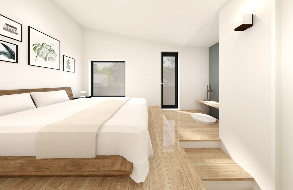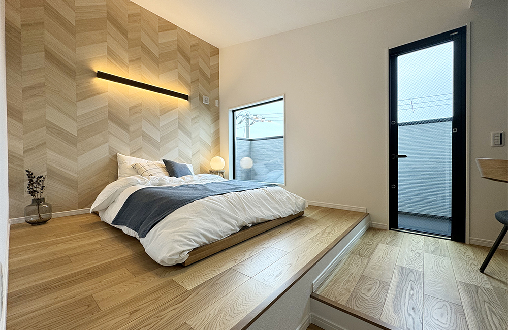 スキップフロアと勾配天井で変化をつけた主寝室は、少し特別感のある、ホテルのような空間に。主寝室内に書斎を設けており、趣味の読書や、ちょっとしたワークスペースとしても利用できます。主寝室は1日の始まりを迎える場所であり、1日の疲れを癒す大切な場所。ただ寝るだけでなく、リラックスしたり、趣味や自分の時間を楽しめる。そんな快適な空間に仕上げました。