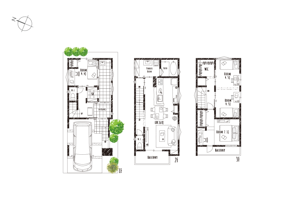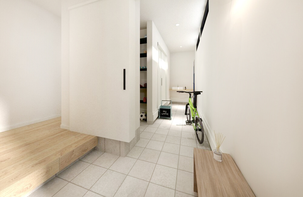 玄関ドアを開けると、一直線に伸びた土間収納が広がり、お気に入りの自転車やアウトドア用品が出迎えてくれるお家が完成しました。土間収納内には手洗い洗面があり、収納だけでなく、道具のお手入れや趣味用の作業スペースとしても使えます。LDKには折り上げ天井を取り入れ、立体感と開放感のある空間に。リビング収納や可動棚、カップボードにキッチンの固定棚など、適材適所の収納も意識しました。また、浴室・洗面室などの水廻りも同じフロアにまとめ、毎日の料理や洗濯をラクにこなせる動線となっています。3階にはスキップフロアと勾配天井のあるホテルライクな主寝室や、ご家族の成長やライフスタイルの変化に適応できる、将来間仕切りのある部屋も設け、永く楽しみながら住まえるお家に仕上がりました。