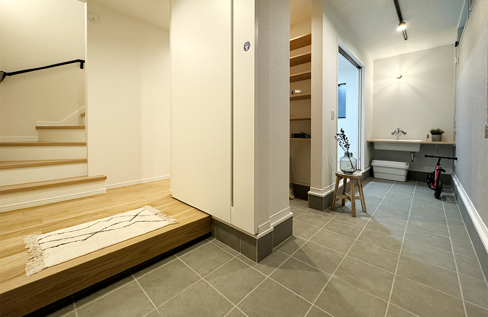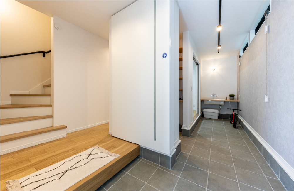 ゴルフバッグやアウトドア用品、ロードバイクなど、大きなものでも余裕をもってしまえる土間収納。玄関前にはスロープを設けており、ベビーカーや自転車などがスムーズに運べます。急な来客でも扉を閉めるだけで目隠しがさっとでき、土間収納と1階の居室が繋がっているのも嬉しいポイント。オープン棚やショーケースを設置し、お気に入りのコレクションや観葉植物を飾って楽しむこともできます。また、手洗い洗面が付いているので、大切な道具のお手入れやDIYなど、趣味用の作業スペースとしても使える空間です。