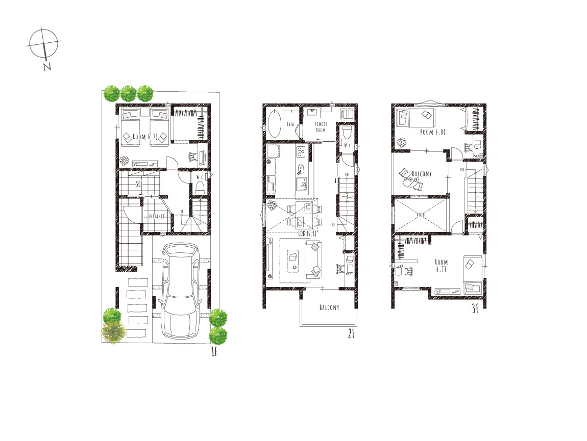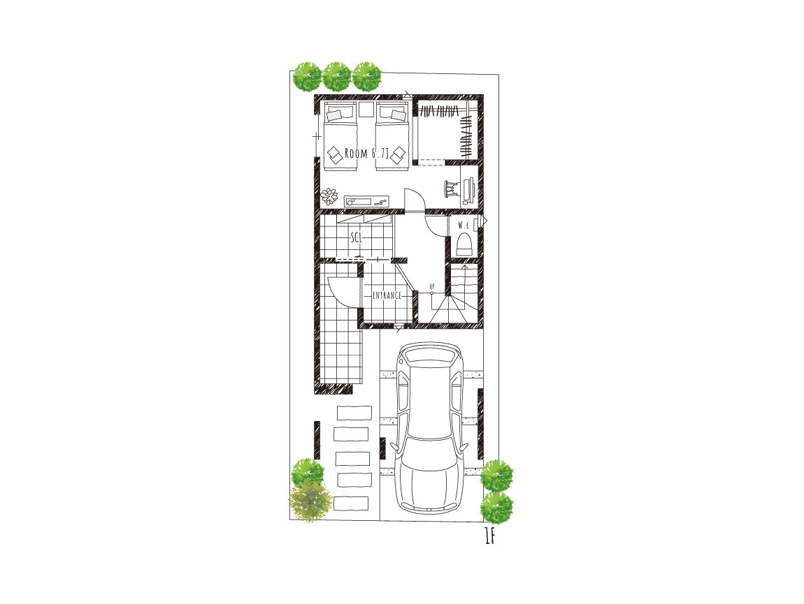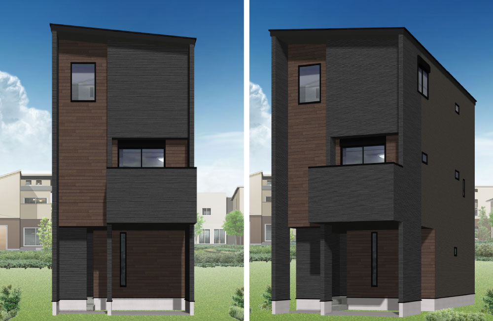 ブラック×木目の男前な外観。玄関ドアを前面道路から見えない位置につけることで、プライバシーが守られ、見た目もすっきり。インナーガレージになっているので、雨の日の車の乗り降りもスムーズに、自転車も濡らさず置けます。