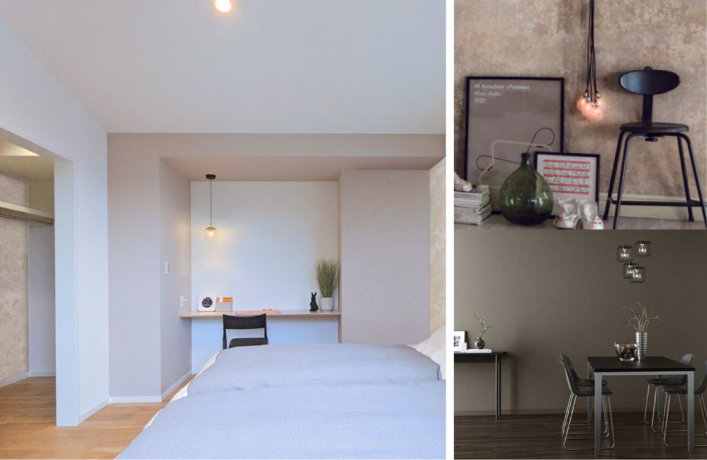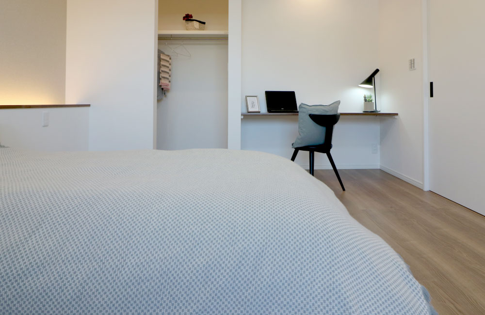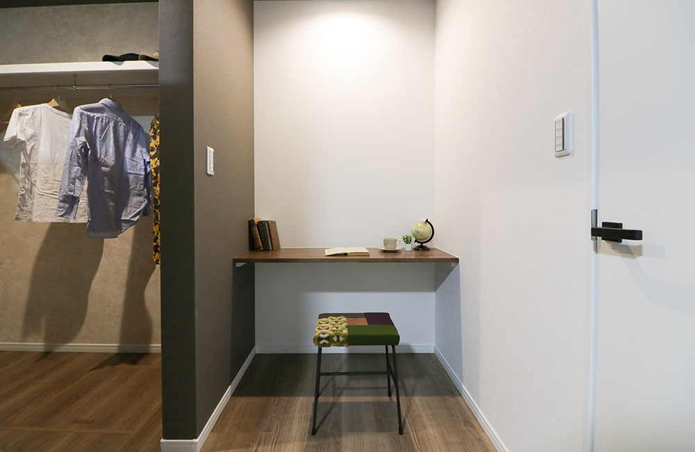 素朴な風合いの石目調のクロスにマットなブラッククロスを施した、クールなイメージの主寝室。お仕事スペース として使用できる、ワークカウンターをご用意しました。ウォークインクローゼットのすぐ隣りにあるので、出かける前の「洋服を選ぶ→スタイリング→身支度」までがスムーズにすみます。好きな雑貨や写真を飾って ご夫婦らしいインテリア を楽しむこともできますね。