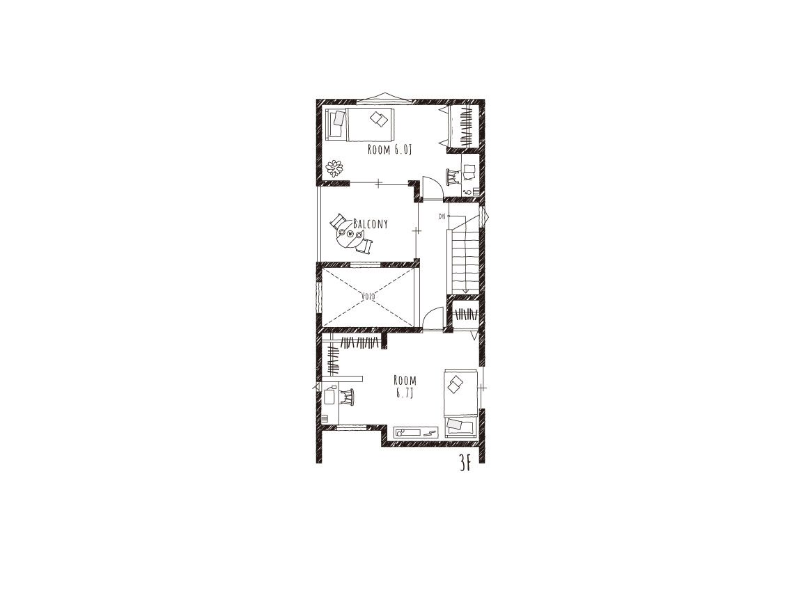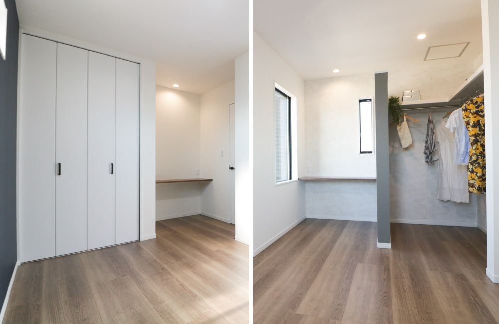 3階にある居室には、2部屋ともにカウンターを設けています。子どもが小さいうちは、おもちゃ部屋&プレイルームとして、将来一人部屋が必要になった時にも、机を購入することなく、そのまま子ども部屋として使うことができます。書斎や趣味のスペースにするにも十分な広さをとっており、使いやすい間取りにしています。造り付けなので「無駄なスペースができてしまった」ということもなく、脚がないのでお掃除もラクになります。