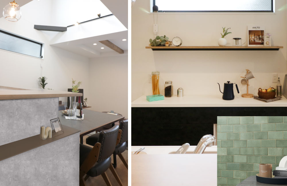 ぐるっとまわりがニッチになっているキッチンカウンターと、壁面をアンティークな雰囲気のタイル調のクロスと飾り棚を施し、まるでオープンキッチンのカフェのような雰囲気。よく使うものや、家電は手の届きやすい位置に、パッケージのかわいい食材やコーヒー道具、スパイスは飾りながら収納。カウンターニッチの正面側は、見た目にこだわり、お気に入りの雑貨や写真を飾って、ダイニング側には、毎日使う調味料やティッシュを隠してメリハリある収納に。横並びダイニングになっているので、家事をしながら、テーブルにいる家族やお客様との会話もたのしめるキッチンです。