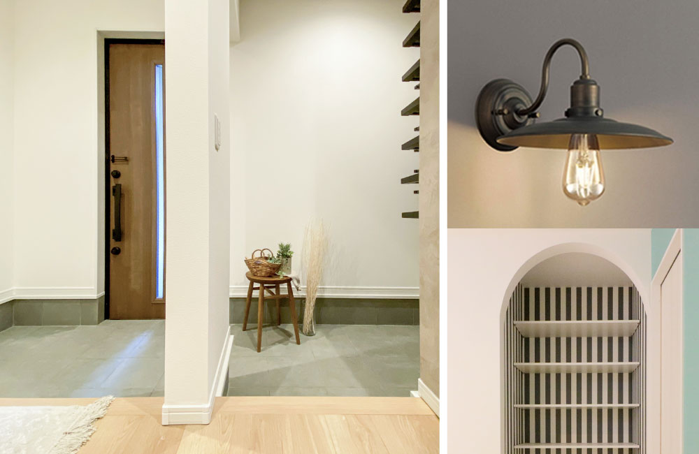 お客様用とご家族用で、玄関を2つに分けました。家族用のシューズクロークの出入り口に引き戸を設置し、玄関先からの来客の視線を遮ることで、散らかった玄関を見られないようにしています。ベビーカーや靴置き場、外出時だけ使う物を置いておけるので、家の中の整理整頓にも一役買ってくれます。家族用玄関の入口はR垂れ壁に、お客様用玄関にはアクセントクロスとアンティーク風ブラケットライトを施し、おしゃれな玄関にしています。