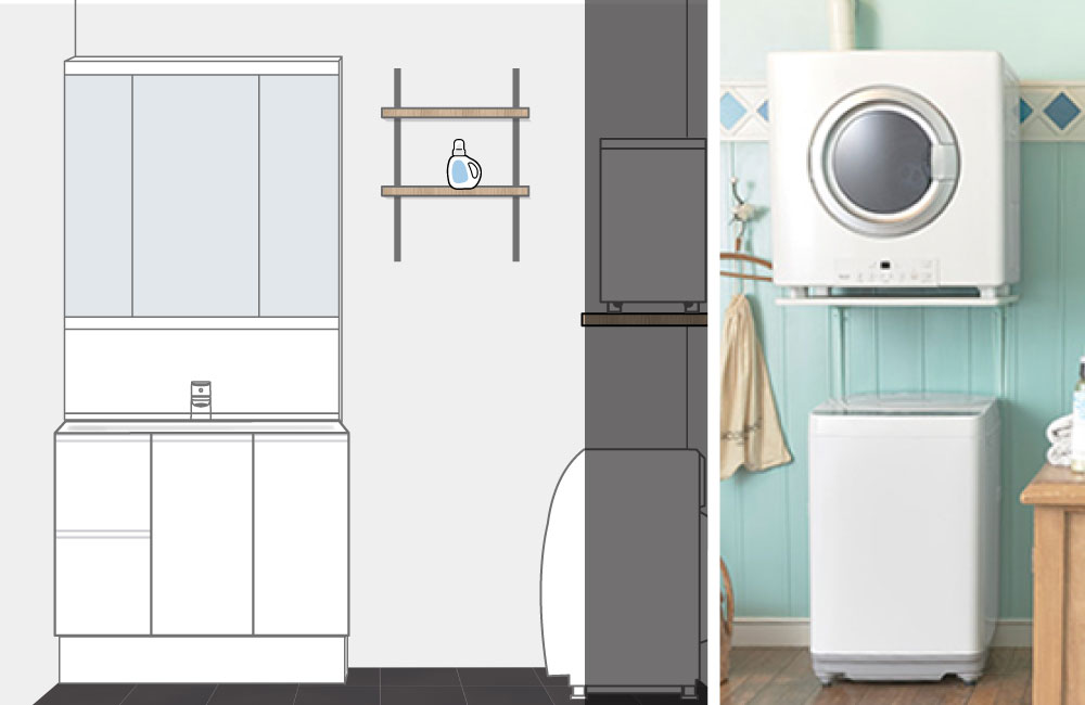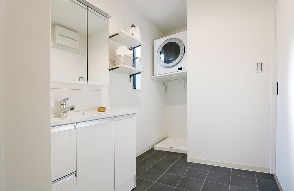 洗濯室には乾太くん(ガス乾燥機)を設置し、1か所でお洗濯が完結できるようにしています。公園で遊んで帰ってきた子供が泥だらけ…!そんな時でも、乾燥まで完結するからどんどん汚されても大丈夫◎スポーツ系の習い事などの、よく洗うユニフォームも、お天気を気にせず、洗濯をその日のうちに終わらせられます。晴れや雨の日、花粉や黄砂など、明日までに乾くかな、といった「考える時間」も節約できるのもうれしいですね。