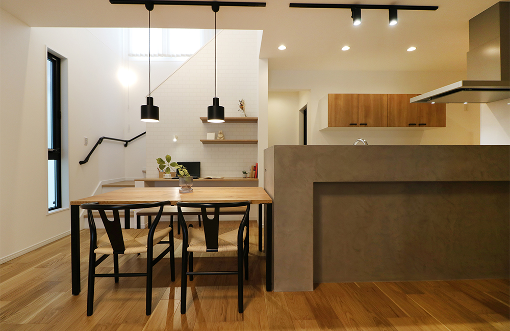 周囲はアパートなど高い建物に囲まれており、窓も多く、視線が集中する敷地だったため、隣地からの視線をコントロールしながら、採光を取り込む工夫として吹抜けを取り入れました。無駄のない充実した間取り、突板やモールテックス仕上げなど、素材感や質感を際立たせたシンプルかつ上質で飽きの来ないデザイン。耐震等級3取得や樹脂窓を採用するなどして住宅性能を高めた長く快適に暮らせる家を計画しました。