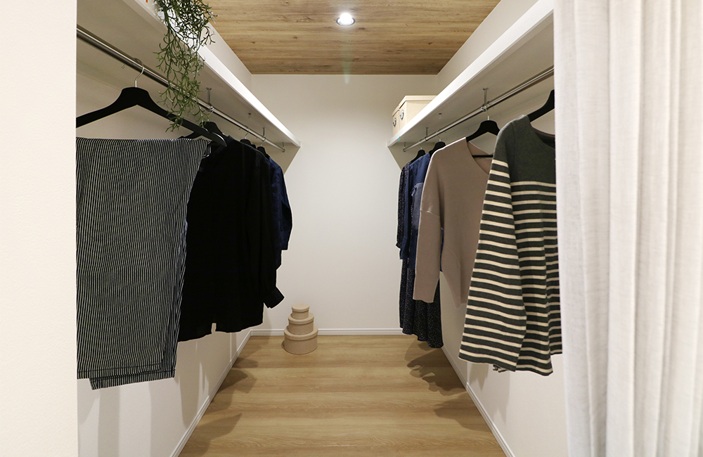 2階には各部屋のクローゼットに加えて、家族の洋服を一ヶ所にまとめられるファミリークロークを設けました。洗濯物を取り込んだ後、わざわざ一人一人に仕分けして、各部屋に持っていく必要が無いので、家事時間を短縮できます。約3.0帖とゆとりのある広さなので、普段使いの服以外にも、シーズン外の洋服や寝具・スーツケースなどもたっぷり収納できます。