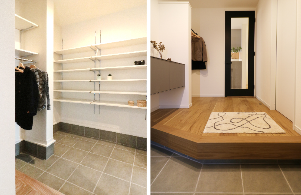 靴やベビーカー、アウトドア用品を収納できる可動棚付きの土間収納に加え、床から浮かせたフロートタイプの玄関収納を設けました。履く頻度の多い靴と、出番が少ないオフシーズンの靴などを分けて収納出来るので、玄関回りがスッキリと美しく整います。ホールにはコート掛けスペースとして、ハンガーパイプを設け、機能性とデザイン性の両方を併せ持つ玄関スペースとなっています。