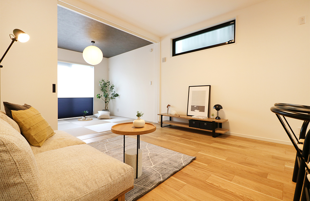 リビングからフラットに続く4.5帖のタタミコーナーは、子供の遊び場や休憩スペースにぴったり。フルオープンにしておけば、リビングとの一体感が生まれ、家族を身近に感じられます。扉で間仕切れば、両親や親戚、友人が遊びに来た際に寝室としても使えます。また、階段部分に吹抜けを設けることで、開放感を演出し、2階とのつながりも感じられます。