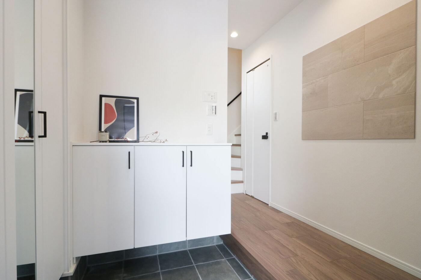 玄関には大容量の玄関収納(下駄箱)と、ゴルフバックや子供のお出かけセット、部活の道具など、外出時の身の回り品をしまっておける土間収納を設けました。普段使わない靴や、アウトドア用品を分けて収納できるので、いつでもスッキリ。また、玄関ホールの壁面には、天然石を模したエコカラットを配し、見た目だけでなく、ニオイや嫌な湿気などの不快感も緩和してくれ、ワンランク上の玄関空間に仕上がりました。