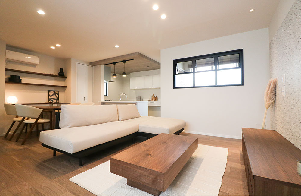 LDK空間に、フレキシブルに使える書斎や、ゆったりくつろげる畳コーナーが一体となった、自分時間を大切にしながら、ご家族の繋がりを緩やかに感じられるお家が完成しました。ご家族が快適に、余裕をもって暮らせるよう、適材適所の収納や幅の広い洗面カウンターを設け、脱臭効果のあるエコカラットや2階からでも玄関ドアを施解錠できる「ファミロック」など、生活がより豊かになる、嬉しい要素をたくさん取り入れました。内装は、トレンドのくすみカラーを取り入れた突板のフローリングをあしらい、ホワイトをベースに、アクセントで木目や石目調のクロスなど、落ち着いた雰囲気でまとめました。また、忙しい毎日の中、ちょっとした時間を1階のプライベート感あるテラスで過ごすことでリフレッシュでき、週末BBQなどで家族と過ごす時間も楽しくなる、気取らずカジュアルに住まえるお家です。