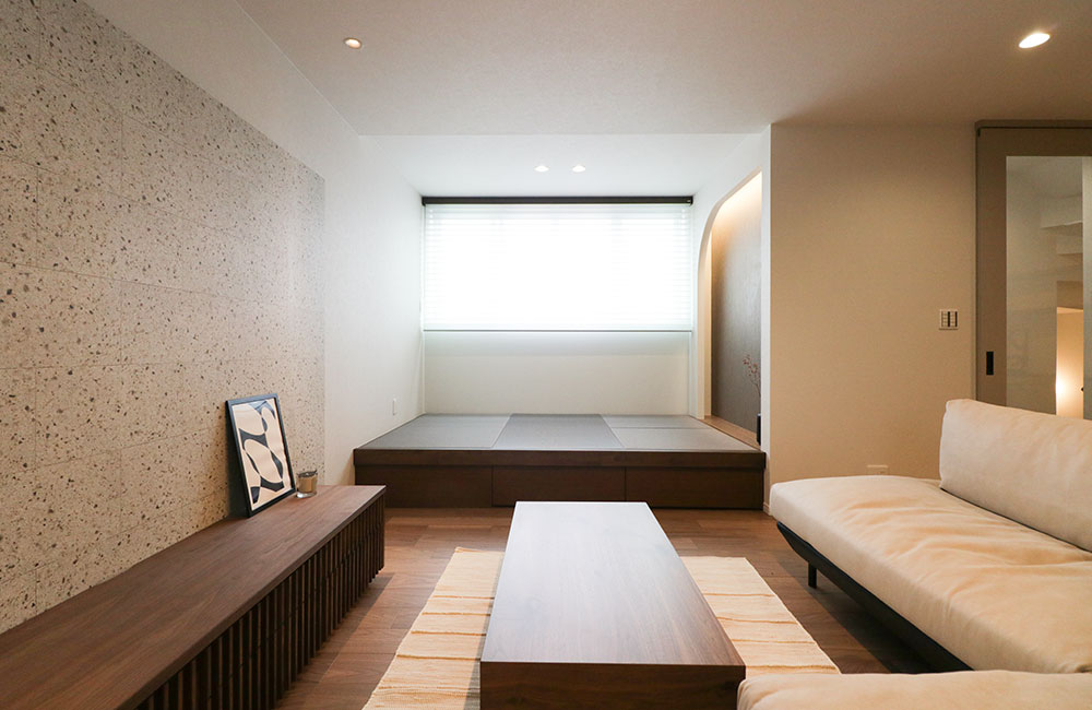 リビングの一角に小上がりの畳コーナーを設けました。垂れ壁と間接照明で落ち着いた雰囲気を演出した畳コーナーは、お子様の遊び場や寝転んでゆったりしたり、ベンチのように並んで座ったりと様々な「くつろぎ方」が出来る空間です。また、段差を利用した収納スペースには、子供のおもちゃやオフシーズンの衣類などがしまえ、リビングをいつでもスッキリ保つことが出来ます。
