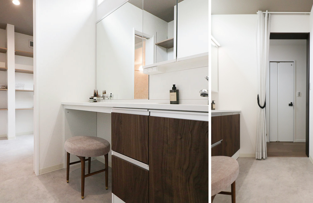別々の人が同時に使えるように、洗面室と脱衣室を分けました。もし誰かが入浴中でも、出てくるのを待たずに、手洗いやハミガキ・洗顔など、洗面台を気兼ねなく使用できます。洗面台は幅の広いカウンター付タイプで、2人並んで使えるため、混雑する朝の身支度もスムーズに。また、来客時にも洗濯物などの生活感が出にくく、お客様にも気兼ねなく洗面台を使ってもらうことができます。