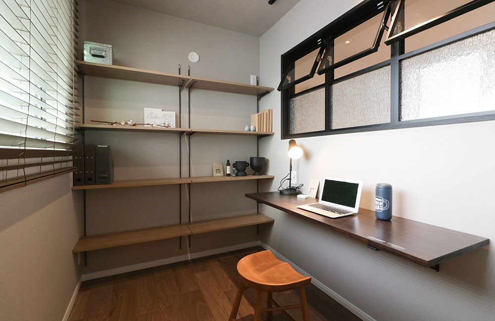 LDKと同じ空間に、リモートワークや趣味に集中できる、程よい広さの書斎を設けました。家で仕事をする時など、ご家族と距離を置いて、静かな時間を過ごせる空間です。室内窓を通じて、光や風を取り入れ、リビングにいる子供の様子が見れたり、家族の気配を感じられるので、安心して勉強や仕事に取り組めます。また、備え付けのカウンターを折りたたむことで、キッズスペースとしても利用できる、使い勝手の良い書斎です。