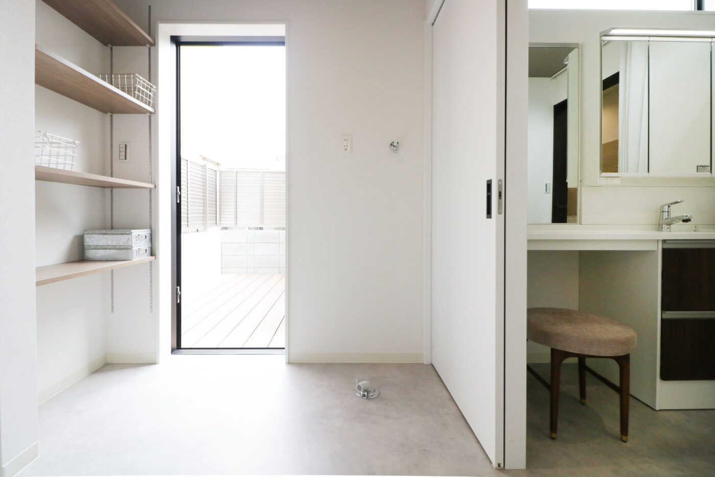 目隠しフェンスで隣地からの視線を遮り、周囲を気にせず外干しが出来るスペースとして、脱衣室から繋がる約3.1帖のテラスを設けました。わざわざ重い洗濯物を持って、階段を上り下りする事なく「洗う」→「干す」の洗濯作業がスムーズに。脱衣室内には、収納棚を設けているので、タオルや下着などはそのまま収納できます。また、天気のよい休日には、家族でのんびりお茶をしたり、子供のプールや遊び場、BBQなども楽しめそうです。