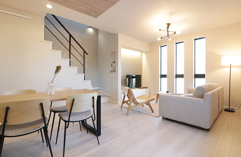 シンボリックなブラックのアイアン手すりと、吹抜けのリビング階段が印象的な、デザイン性あるリビング。テレビボード背面には、ふわっと間接照明を灯し、並んで切ってあるサッシのブラックと、ダイニングの折下げ天井とキッチンカウンターに配したグレーがアクセントになり、おしゃれな雰囲気に。リビング階段は、出かける際にリビングを通り、自然と顔を合わせられ、コミュニケーションも取りやすいつくり。明るく心地よく過ごせ、自然とリビングに家族が集まってくる、そんな空間にしています。