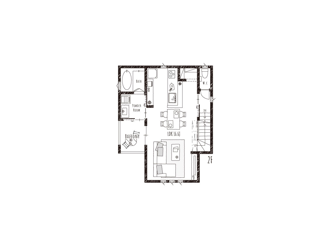 シンプルな間取りの中に「生活のしやすさ」「家事のしやすさ」「デザイン性」「抜け感」を取り入れた、グレージュの家が完成しました。外からの視線を気にせず過ごせる2階リビングや、片づけやすい2WAY玄関、「ながら家事」ができるように、キッチンを中心に水廻りを2階にまとめました。天井を高くとったリビングには吹抜けや間接照明を用い「空間に抜け感や開放感」をあたえ、階段手すりをブラックのアイアンにすることで「シンボリックなリビング階段」にするなど、見どころある工夫を散りばめています。内装にはいろいろなテクスチャーのグレージュ色を重ねてワントーンでまとめ、手すりやカウンターなど所々にブラックやグレーを効かせてシンプルに。コンパクトながらも特別感を持って住まえる、明るくさわやかなお家にしています。