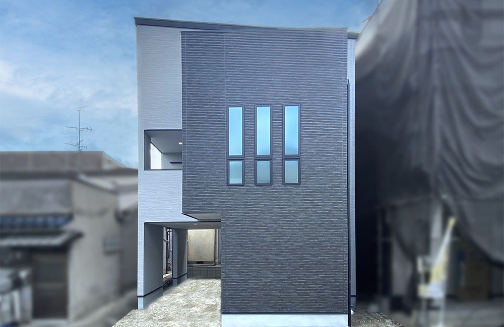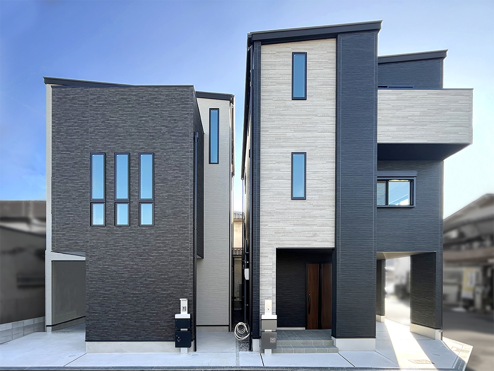 明るいグレーを基調に、ダークブラウンの石目調の外壁をアクセントに、カジュアルながらも軽くなりすぎないよう演出しました。玄関ドアと自転車を置けるポーチを壁で隠すことで、見た目をすっきりおしゃれにしています。家の中が見えないことで、プライバシーを守るだけでなく、防犯や飛び出し防止策にもなるようにしています。(写真左側)