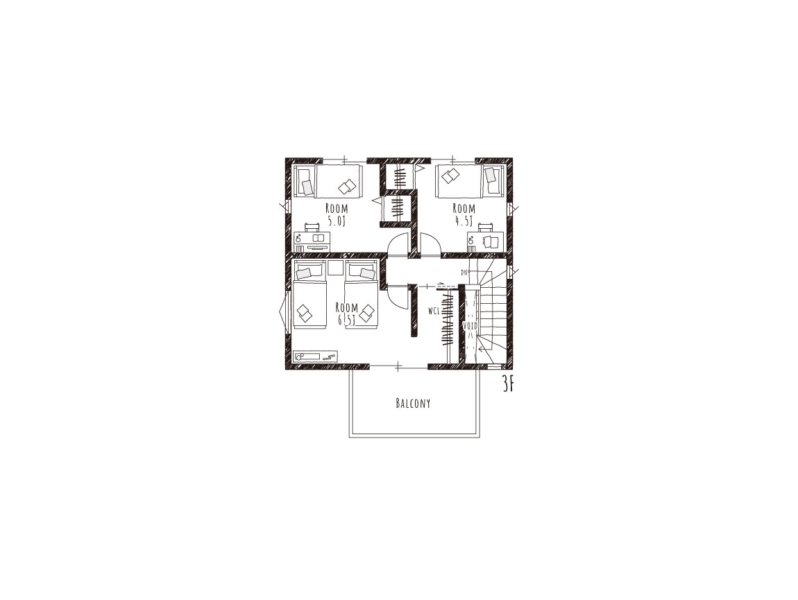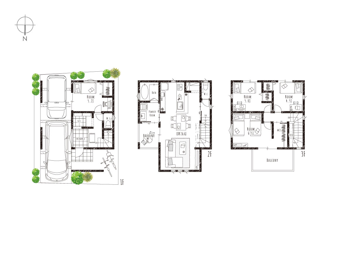 そこまで広くはない敷地で、2方向に比較的古い建物があり、もう一方に3階建を新築中という状況で、駐車スペースをしっかり2台分確保しながら4LDKにするため、レイアウトに苦労しました。また、「いかに隣地を気にせず光を取り入れられるか」「いかにリビングを広く見せられるか」「各々の空間の広さを確保しつつ生活し易く、見どころのあるプランにできるか」という所で工夫を凝らしました。