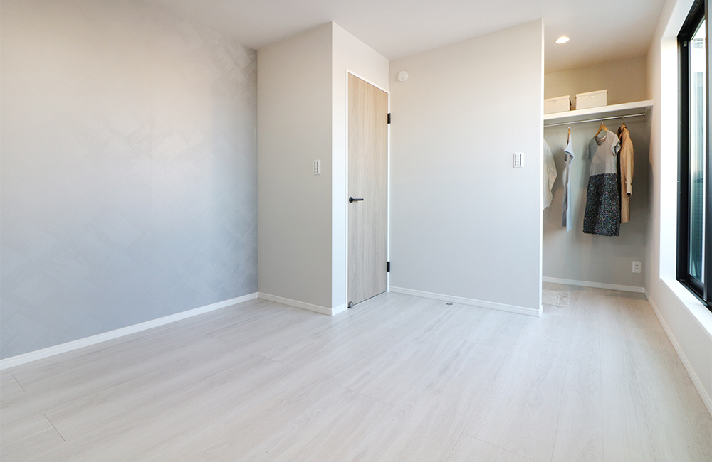 主寝室に、お部屋からも廊下からも出入りできる、ウォークインクローゼットをご用意しました。季節のものや家族が共用で使うものなど、ファミリークローゼットとして多目的に使えるようにしています。クローゼット内には、アーツ・アンド・クラフツ運動で有名なウィリアム・モリスの壁紙を使用。アートな気分を味いながらくつろげる寝室です。
