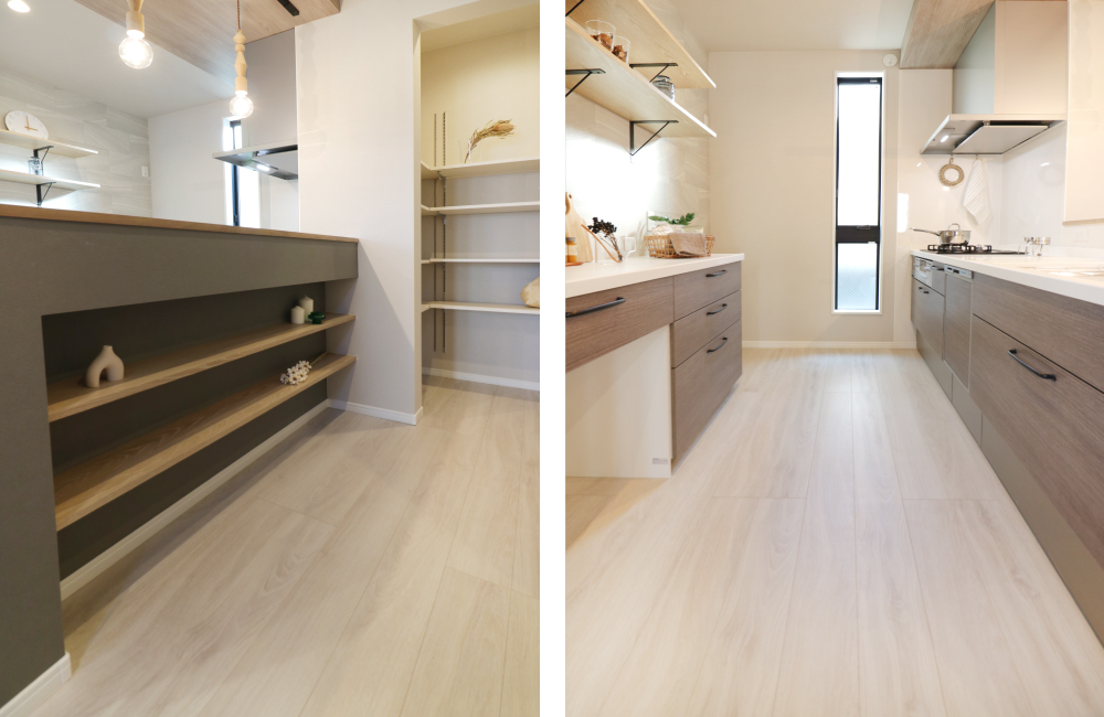 キッチンは壁で手元を隠してスッキリと。壁面にはニッチを施し、飾りながら収納できるスペースに。背面にもたっぷり収納できるカップボードがあるので、家電や調理済みの物を置いたり、足元にゴミ箱を置けば、振り返るだけですぐ使えて動線も短くすみます。飾り棚にお気に入りの雑貨や食器を飾れば、お気に入りに囲まれて、いるだけで楽しくなるキッチンに。