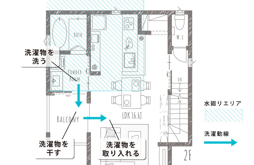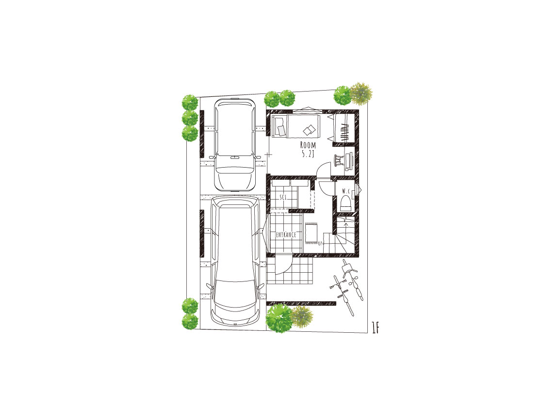 ご家族用とお客様用で分けた2WAY仕様の玄関。ラフに靴を脱いでも大丈夫なご家族用と、いつでもスッキリを保てるお客様用で分けました。ご家族用の玄関には、大容量のシューズクロークを設け、R垂れ壁で仕切りました。ベビーカーやゴルフバッグも置け、扉の無いウォークスルータイプなので、外出時はさっと手に取れ、帰宅時はすぐに片付けられる、スムーズな動線です。