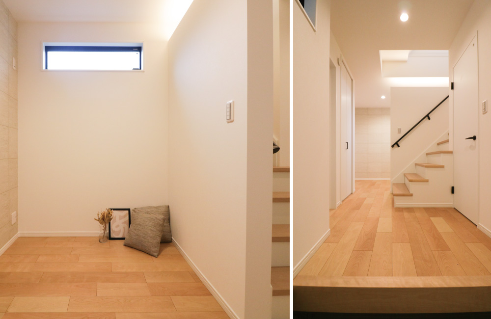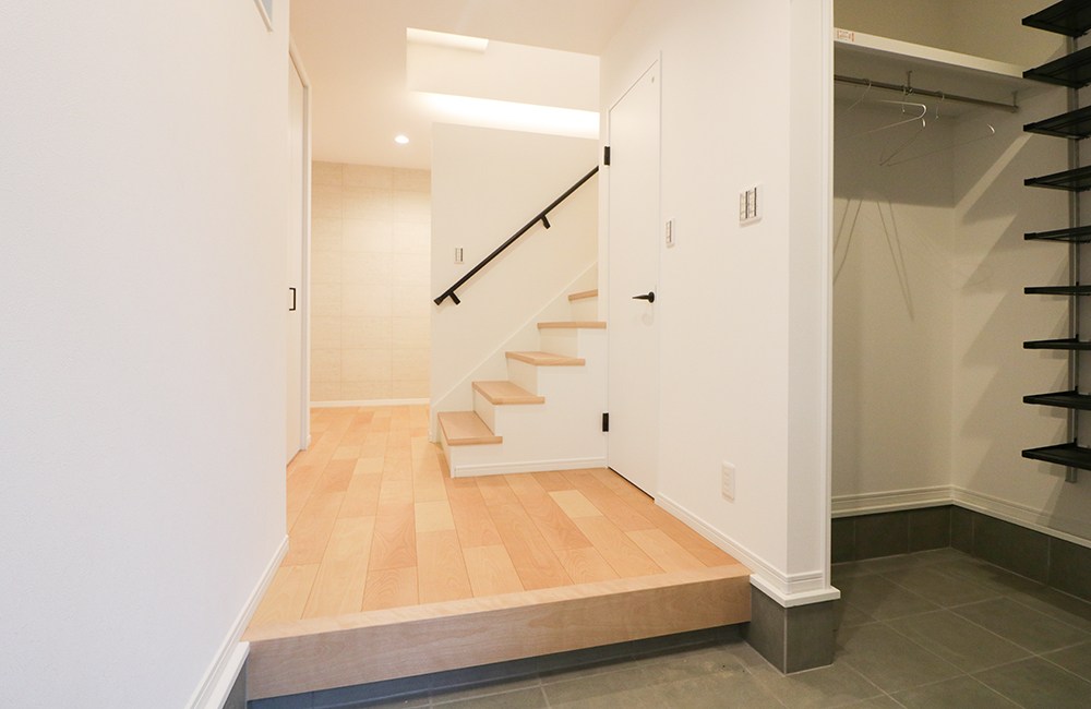 玄関に扉付きの土間収納を設けました。ベビーカーもそのまま片づけてしまえ、カギや帽子などの外出時に必要なものを揃えておけば、お出かけもスムーズになります。備え付けのハンガーパイプにコートなどのアウターを掛けられるので、花粉や外の汚れを家の中に持ち込むことも防げます。ひろびろとした玄関ホールは、突き当りのフリースペースにつながり、ひな壇状の階段と腰壁の間接照明と合わせて、印象的な玄関になっています。