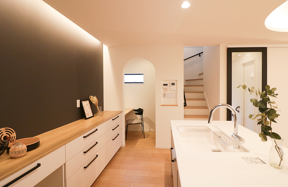 すっきりとリビングを見渡せるオープンキッチンに、壁際の天井から壁を照らす「コーニス照明」を仕込んだキッチン横には、R垂れ壁で仕切った小さな小部屋を設けました。パントリーとして使える可動棚と、こもってお裁縫や、アイロンがけなどもできる、ワークカウンターをご用意しました。キッチン横にあるので、レシピを探しながらお料理したり、洗い物をしながら、子どもの宿題を見たりするにも便利なスペースです。