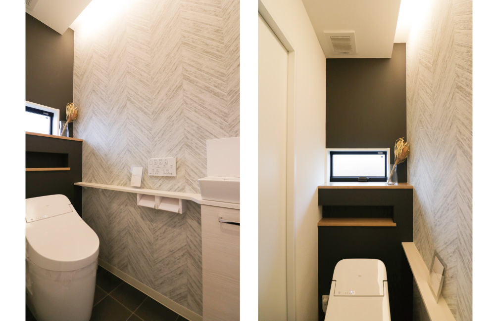 ヘリンボーンのタイル模様が間接照明で照らされ、モノトーンでシンプルな中にも、華やぎを生み出したホテルみたいなトイレに仕上げました。毎日使うものだからこそ、ちょっとこだわって、非日常を感じられる空間にしています。