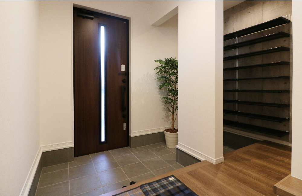 お客様用とご家族用で分けた2WAY仕様の玄関。急な来客時でもスッキリ片付いているお客様用と、ラフに靴を脱いでも大丈夫なご家族用で分けました。ご家族用の玄関には、大容量のシューズクロークを設け、ベビーカーやゴルフバッグ・アウトドア用品も置ける、ゆったりとしたスペースがあるので、玄関まわりをスッキリ見せることが出来ます。